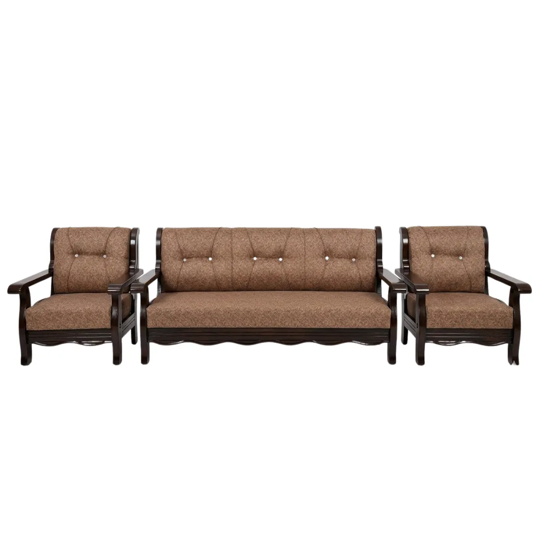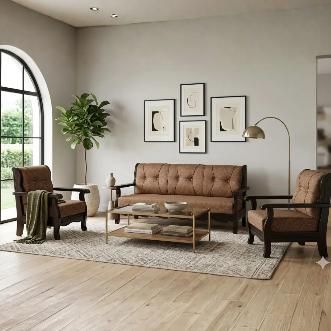 Lakdi ke frame wala classic sofa set jisme light brown upholstery hai.